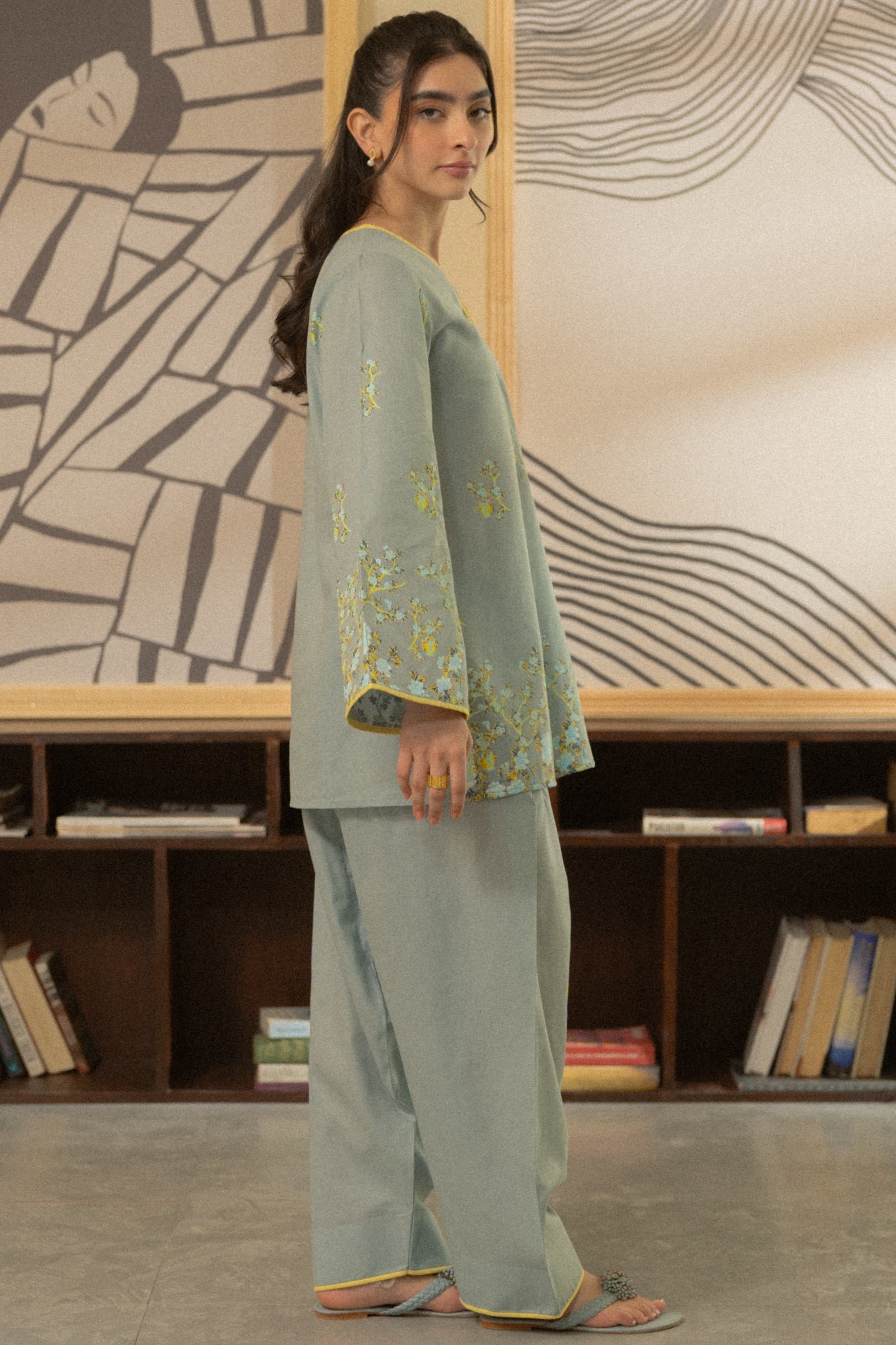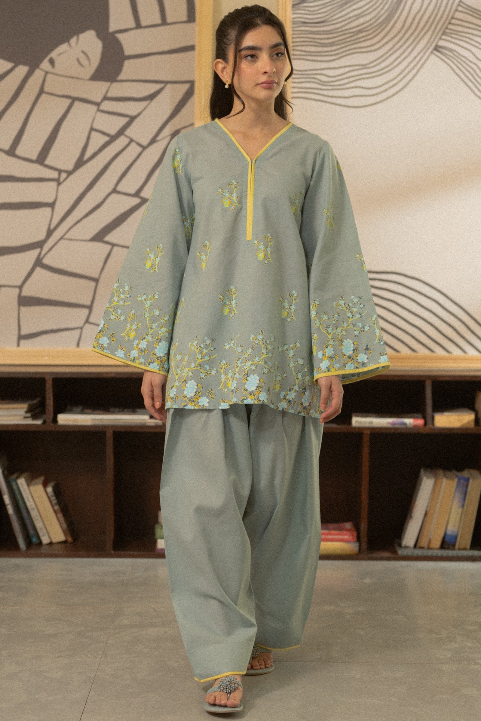 Adorn grace and elegance with this sea blue colored mid-length kurta with hand screen print paired with shalwar.