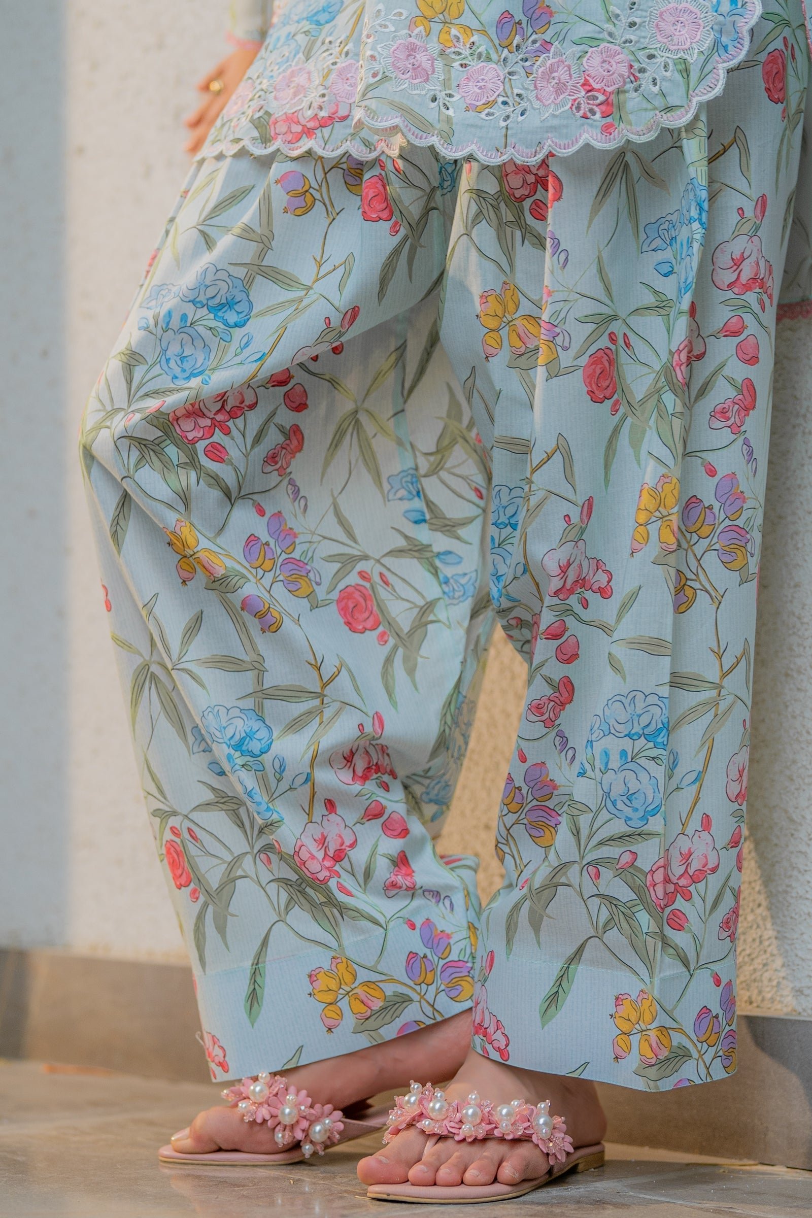 This straight-cut kurta with colorful botanical prints and delicate embroidery along the hem paired with matching tapered trousers, is perfect for a fresh summery look.