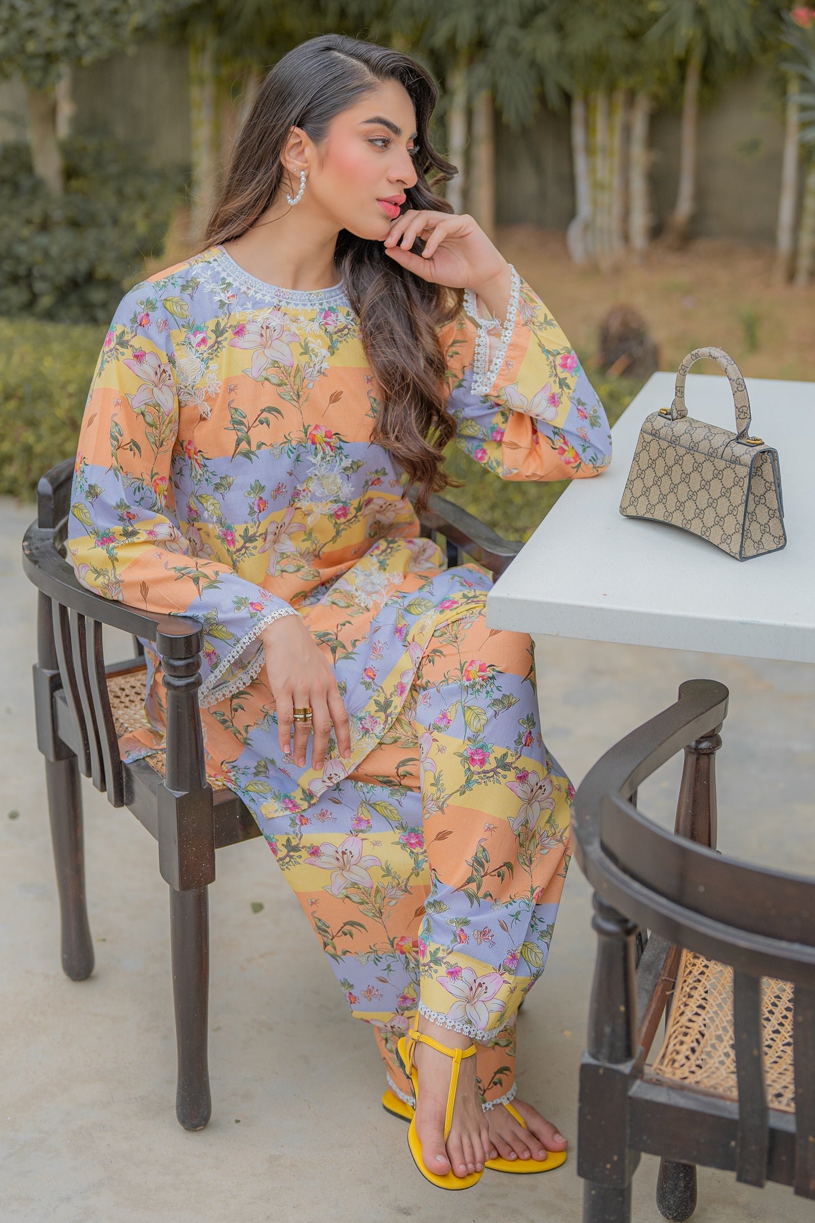This straight-cut kurta and shalwar is a playful blend of peach, lavender, and yellow panels. Adorned with a mix of floral prints and delicate lace trims at the hem, it’s a cheerful pick for effortless daytime elegance.