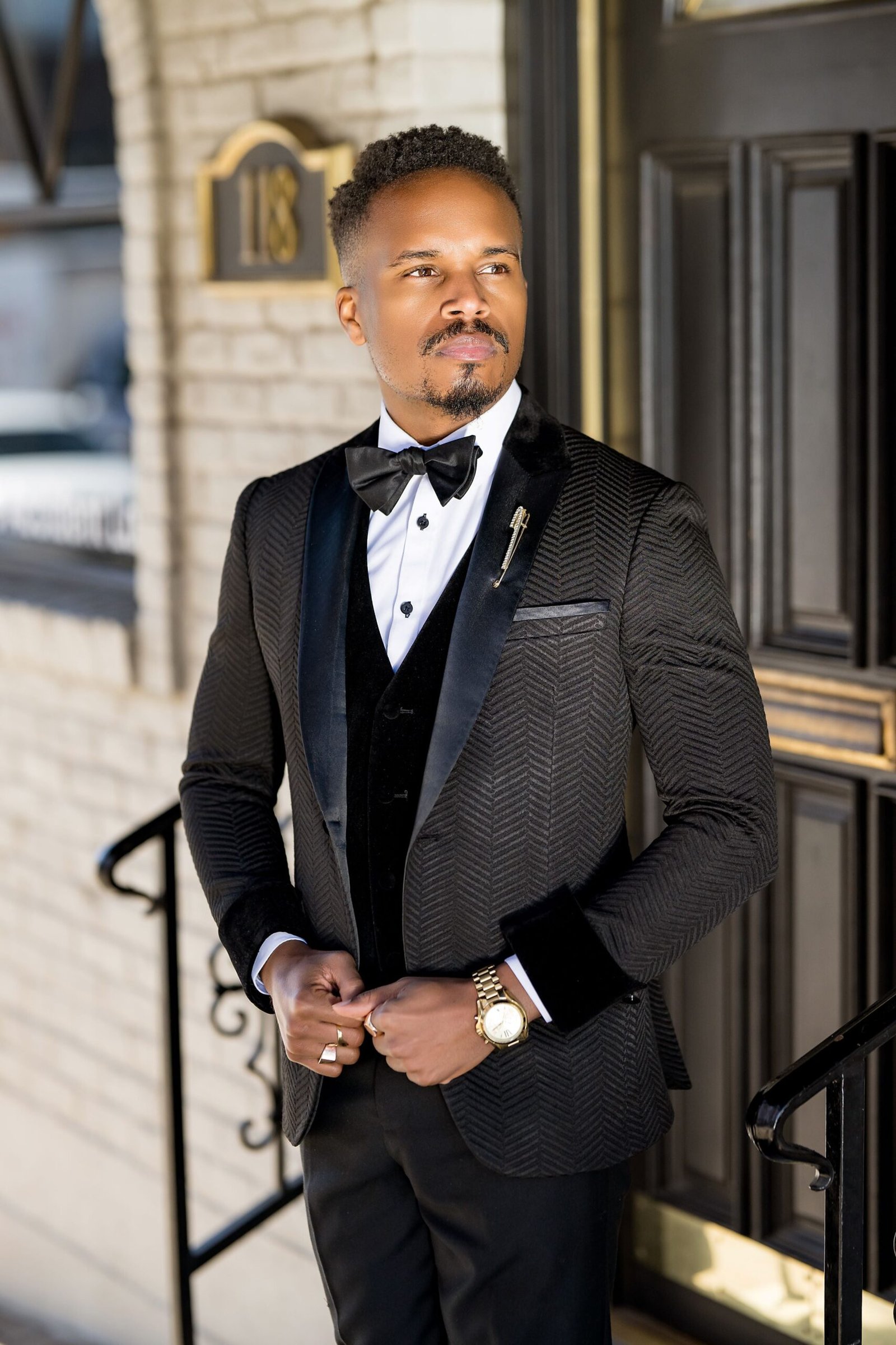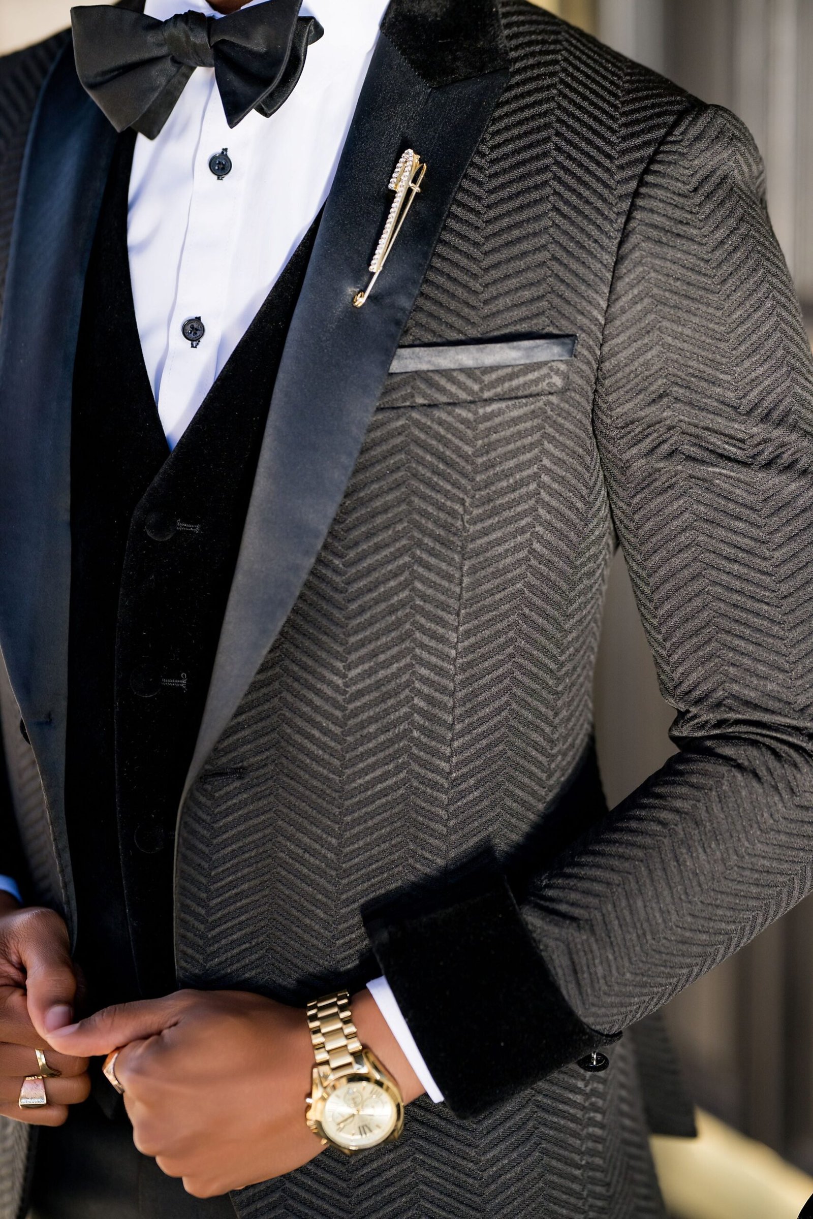 • Paired with sleek black vest, and trousers for a cohesive formal ensemble.