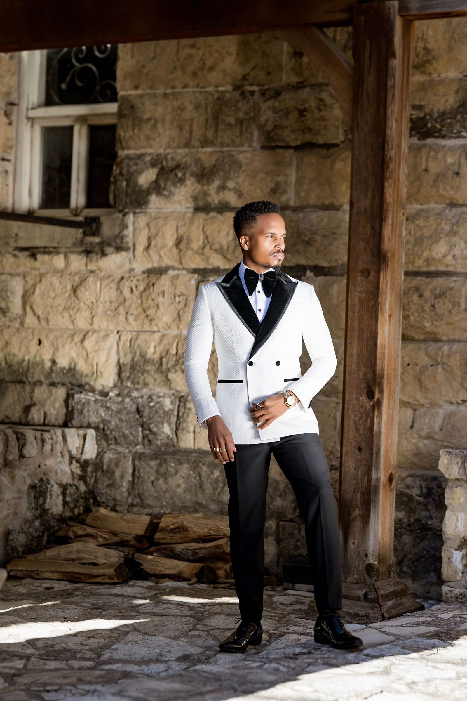 Make a bold and sophisticated statement with this stunning white double-breasted tuxedo. Perfectly tailored for those who value timeless elegance and contemporary style, this suit blends intricate design details with luxurious materials.